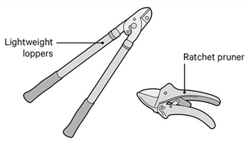 A two-handed lopper will give good leverage without much effort and can be held lightly against your palms and wrists, protecting your finger joints from strain. Some manufacturers also produce 'ratchet loppers' – these have a mechanism which will hold the blades in place if you need to stop mid-cut.