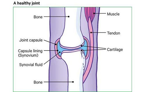 A joint is a part of the body where two or more bones meet – in your knee, it’s the thigh and shin bones. There is also a small bone at the front of the knee called the patella or kneecap.