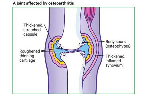 Osteoarthritis causes the cartilage in your knee joint to thin and the surfaces of the joint to become rougher, which means that the knee doesn’t move as smoothly as it should, and it might feel painful and stiff.